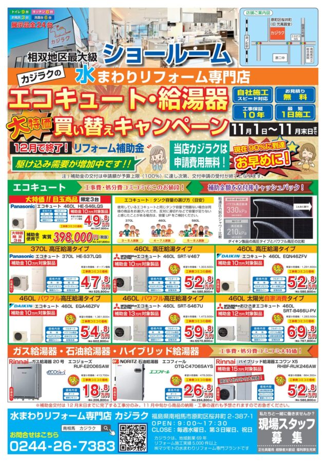 相双地区で給湯器、その他水まわり商品のリフォームをご検討中のお客様は、お気軽にご来店ください!
