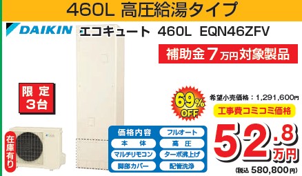 たとえば、ダイキンのエコキュート(EQN46ZFV)をカジラクで交換した場合